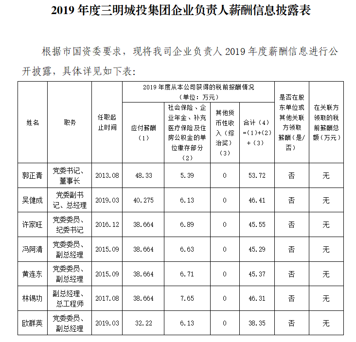 2019年度三明城投集團企業(yè)負責人薪酬信息披露表