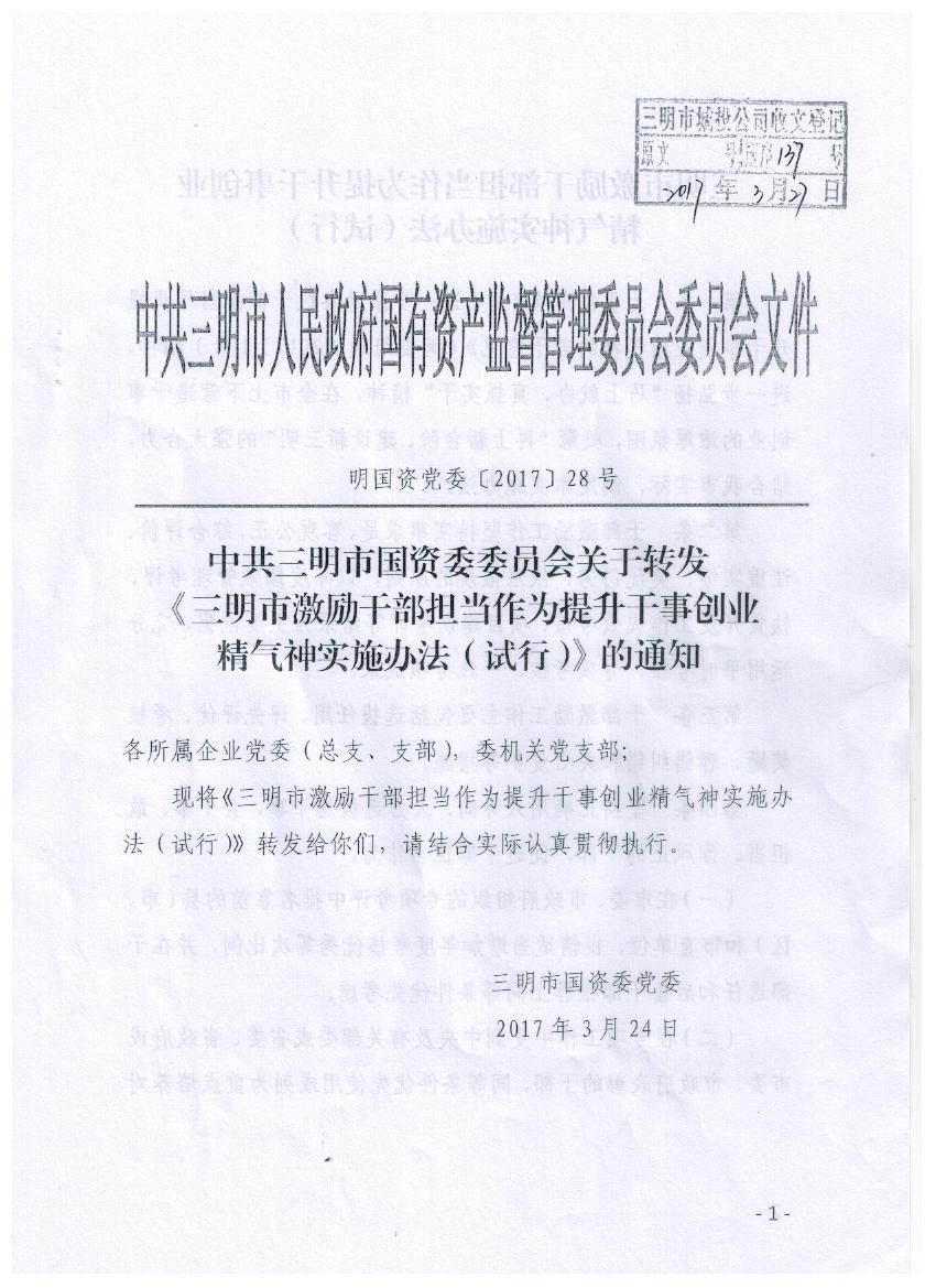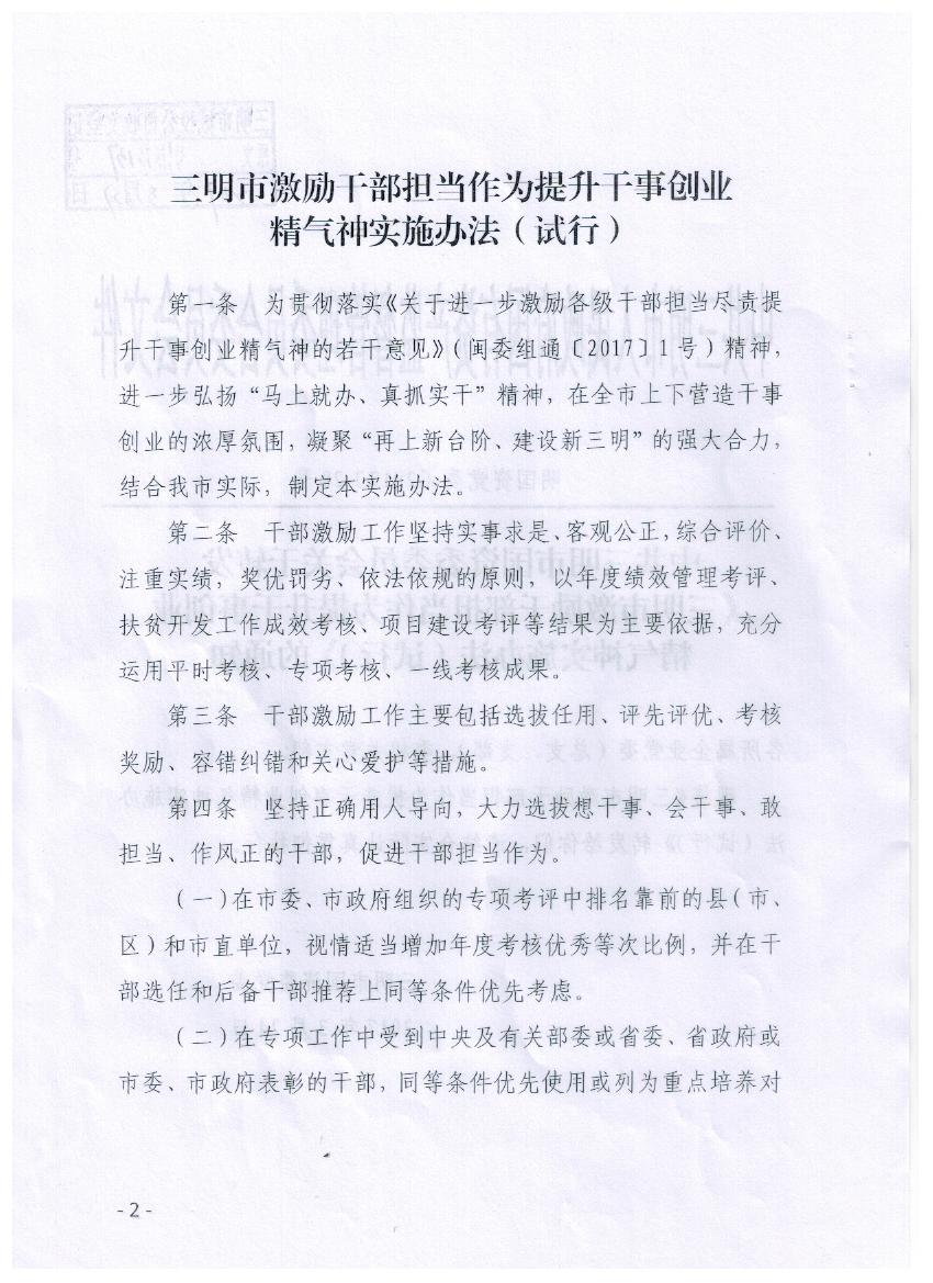 關(guān)于轉(zhuǎn)發(fā)《三明市激勵干部擔當作為提升干事創(chuàng)業(yè)精氣神實施辦法(試行)》的通知
