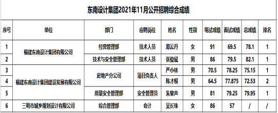 根據(jù)東南設(shè)計(jì)集團(tuán)2021年11月9日發(fā)布的招聘公告,現(xiàn)將綜合測(cè)試成績(jī)公示如下: