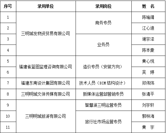 根據(jù)市城發(fā)集團2024年3月29日發(fā)布的招聘公告,通過報名、資格審查、面試、筆試等程序,現(xiàn)將擬錄用人員名單公示如下:
